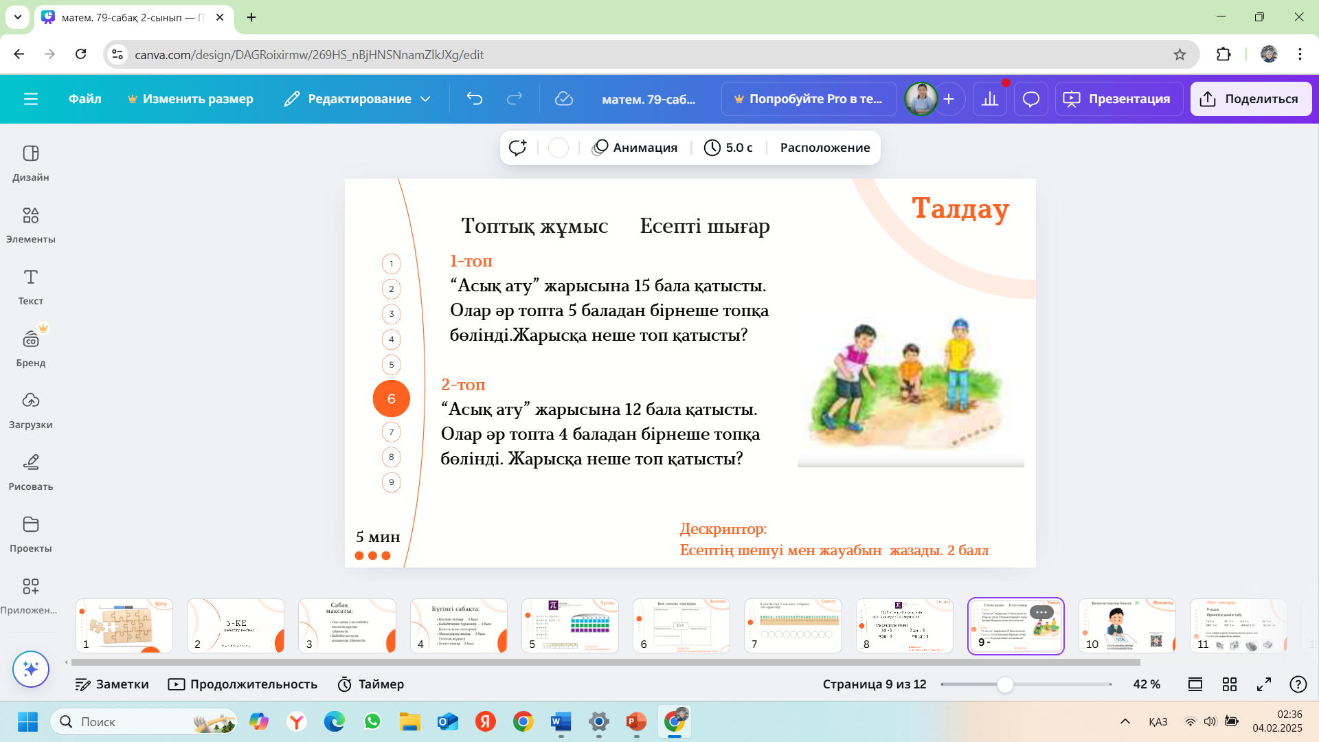 Дескриптор: Есептің шешуі мен жауабын жазады. 2 балл
