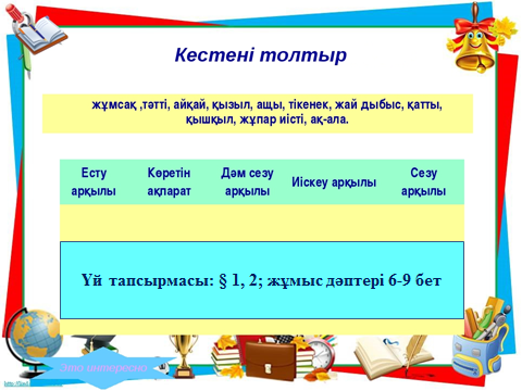 Жаңа тақырыпты түсіндіру. Презентация. Ақпарат-қоршаған ортада болып жатқан құбылыстар мен хабарлар туралы мәліметтер, ал қоршаған орта-ақпарат көзі. Топтық жұмыс. 1-тапсырма. «Үштік» әдісі -Қалай ойлайсың, ақпаратты тек адам ғана пайдалана ма? Жануарлар мен өсімдіктер ше? Мысалдар келтір. Дескриптор: -жануарлар ақпаратты қалай қолданатыны туралы мысалдар келтіреді; -өсімдіктер ақпаратты қалай қолданатыны туралы мысалдар келтіреді. ҚБ: жұлдыз /4 балл/ Жеке жұмыс. 2-тапсырма. Жұмыс дәптері, 6-7 бет. Дескриптор: -суреттерге қарап ақпарат алу жолдарын көрсетеді; -өзі пайдаланатын ақпарат көздерін жасыл түспен бояйды; -қалғандарын қызыл түспен бояйды. ҚБ: жұлдыз / 2 балл/ Жеке жұмыс.3-тапсырма. Жұмыс дәптері, 9 бет. Дескриптор: -суретке қарап дұрыс әрекеттерді жасыл түспен белгілейді; -бұрыс әрекеттерді қызыл түспен белгілейді. ҚБ: жұлдыз / 3 балл/ |