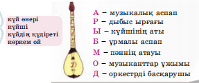 Дәптермен жұмыс «Кім жылдам?» ойыны. Суреттегі домбыраның әрбір дыбысынан басталатын өнерге қатысты сөздерді тап. .