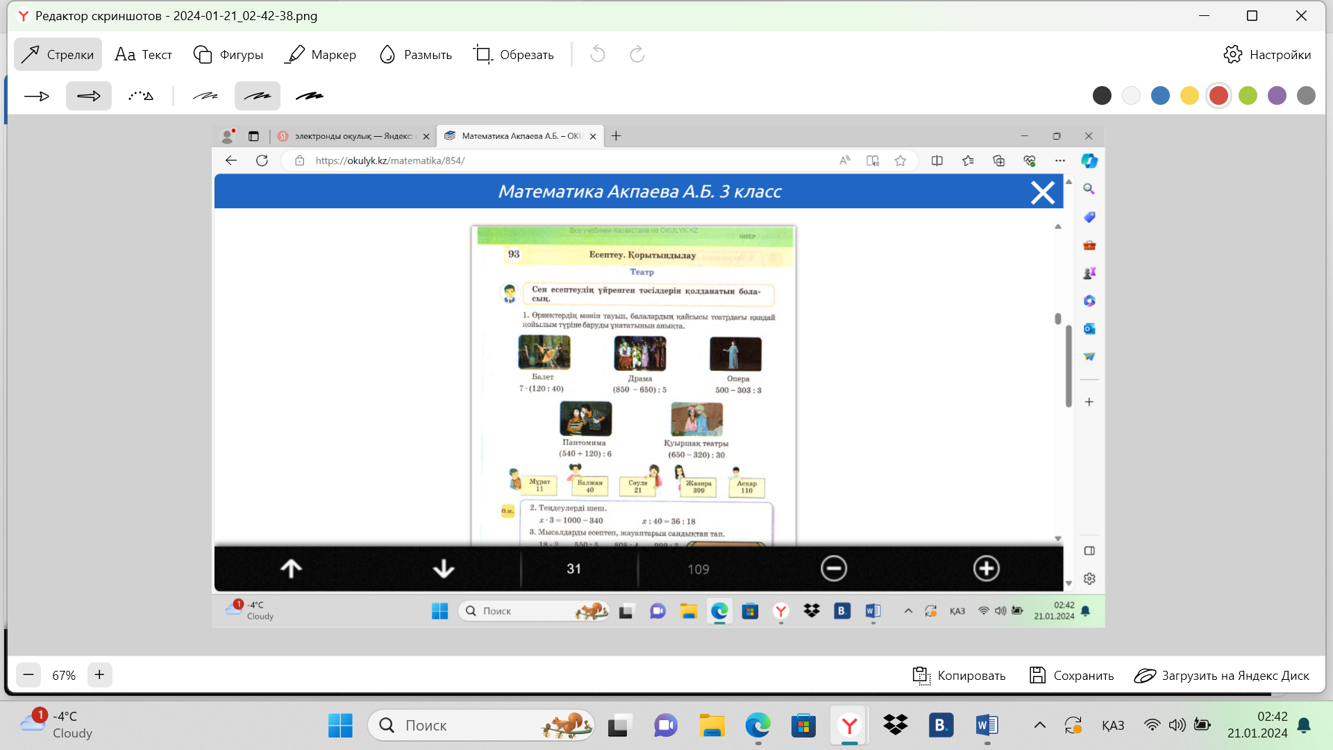 Өрнектердің мәнін тауып,балалардың қайсысы театрдағы қандай қойылым түріне баруды ұнататынын анықтайды. Тапсырманы өз беттерімен орындайды. Теңдеулерді шешеді. Мысалдарды есептеп, жауаптарын сандықтан табады. Есепті шығарады. Қысқаша жазылуы бойынша есептер құрастырып, шығарады. Өрнектерді есептейді, дұрыстығын тексереді. Жұппен тапсырманы орындайды. |