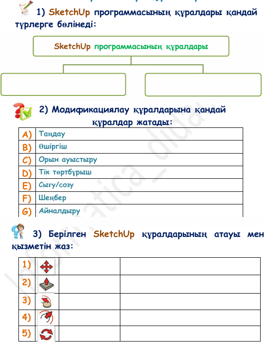 3)Берілген SketchUp құралдарының атауы мен қызметін жаз: