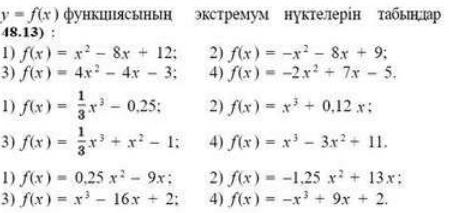 1-тапсырма 48.3 y=f(x) функциясының экстремум нүктелерін табады. 1)f(x)=x+4; 2)f(x)=-x+9; 3)f(x)=-5x+7; 4)f(x)=4x-11. |