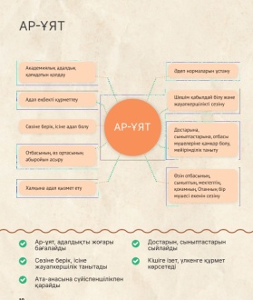 Психологиялық ахуал «Жүректі тазарту» Оқушыларға таза парақшалар таратылады. Оған дәл қазіргі кездегі ойындағы кірбіңді, ренішті, қолайсыз көңіл күйді жазу ұсынылады. Жазып болған соң, қоқыс жәшігіне тастайды. Осылайша барлық жағымсыз көңіл күйден арылып, тазарған жүрекпен, көтеріңкі көңіл күймен сабақ басталады. Шығармада қандай құндылықтар көрініс тапқанын топтастыру әдісі арқылы жинақтайды. Шығарма кейіпкерінің тұлғалық ерекшеліктерін талдайды. Анықталған қасиеттеріне шығармадан дәлелдер келтіре отырып, кейіпкердің тұлғалық ерекшелігін сипаттап, эссе жазады. «Баспалдақ» әдісі бойынша оқушылар өзін-өзі қандай деңгейде тұрғанын анықтап, бұл сабақты игере алған немесе игере алмағанын айтады.