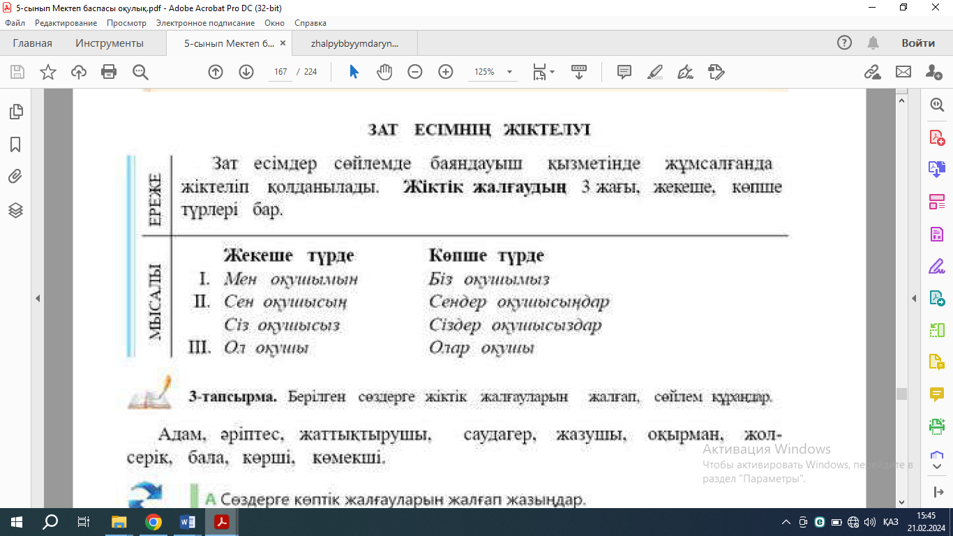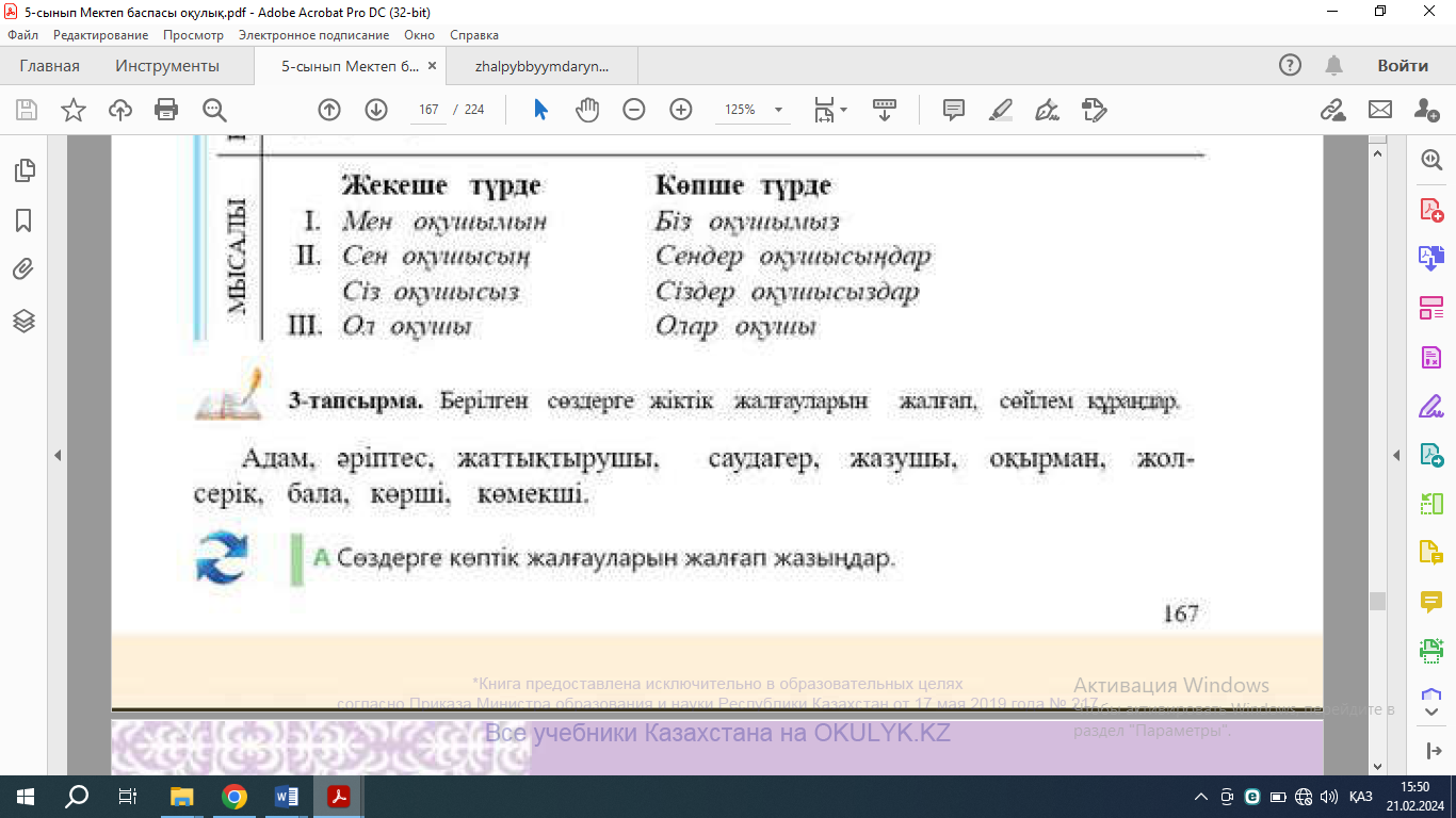Оқушылар 1,2,3 деп санау арқылы үш топқа бөлінеді. 1-топ. 3-тапсырма. Берілген сөздерге жіктік жалғауларын жалғап, сөйлем құраңдар. Сөздерге көптік жалғауын жалғап жазыңдар.
