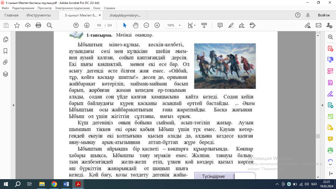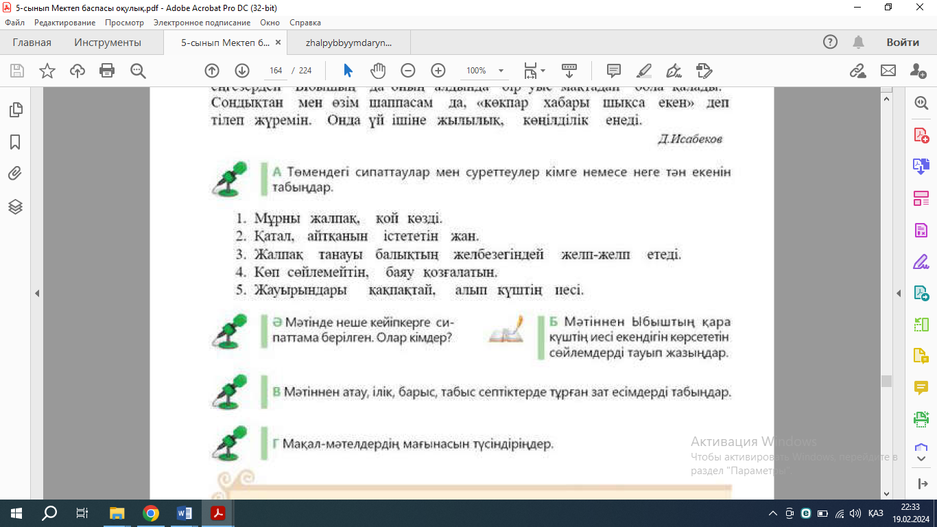 Мәтінді мұқият оқиды. Оқылым мәтініне байланысты топтық тапсырмалар орындайды. 1-топ. Төмендегі сипаттаулар мен суреттеулер кімге немесе неге тән екенін табады; Ойларын дәлелдейді.