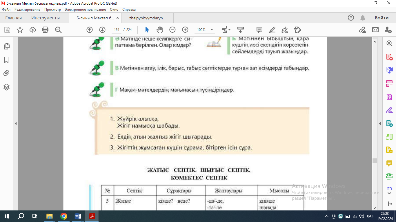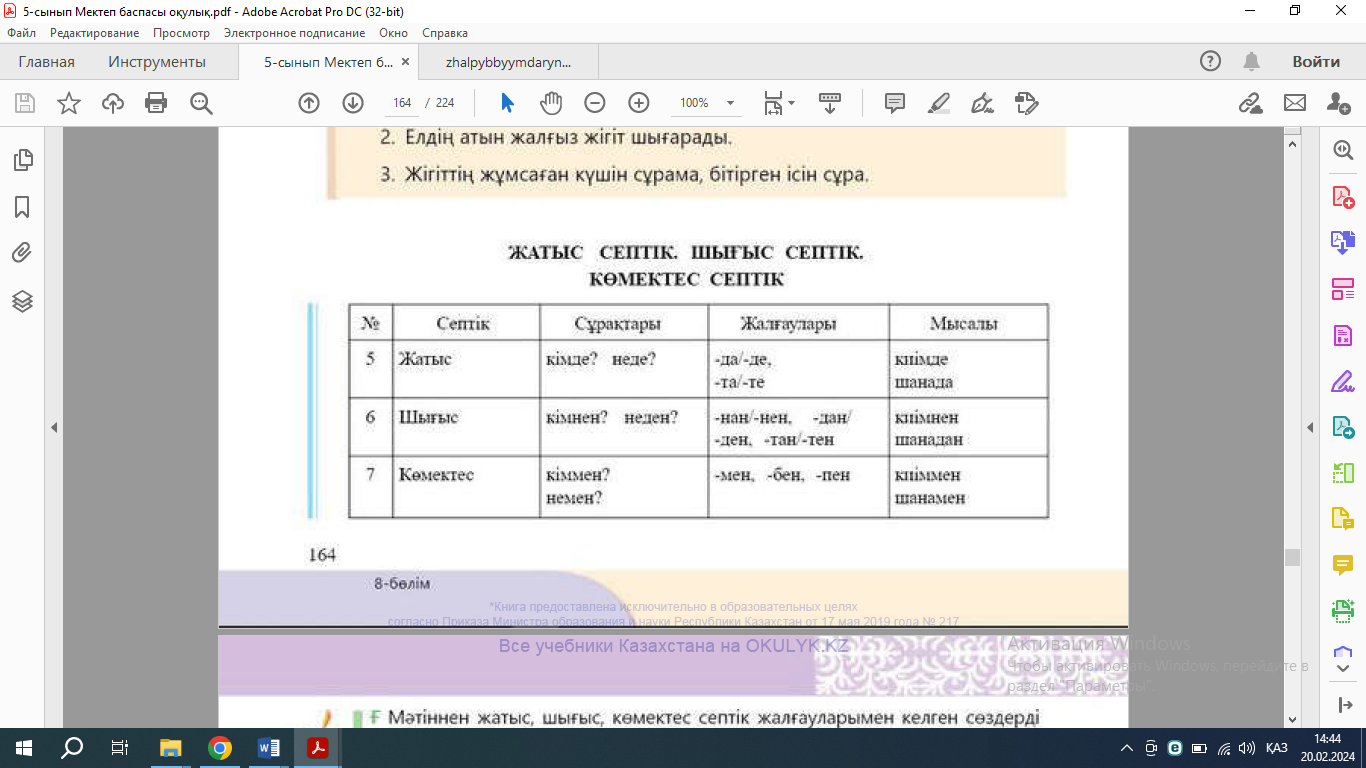 Жұптық жұмыс. Ғ. Мәтіннен жатыс, шығыс, көмектес септік жалғауларымен келген сөздерді тауып, үлгіге сәйкес талдаңдар, мағынасын көрсетіңдер.