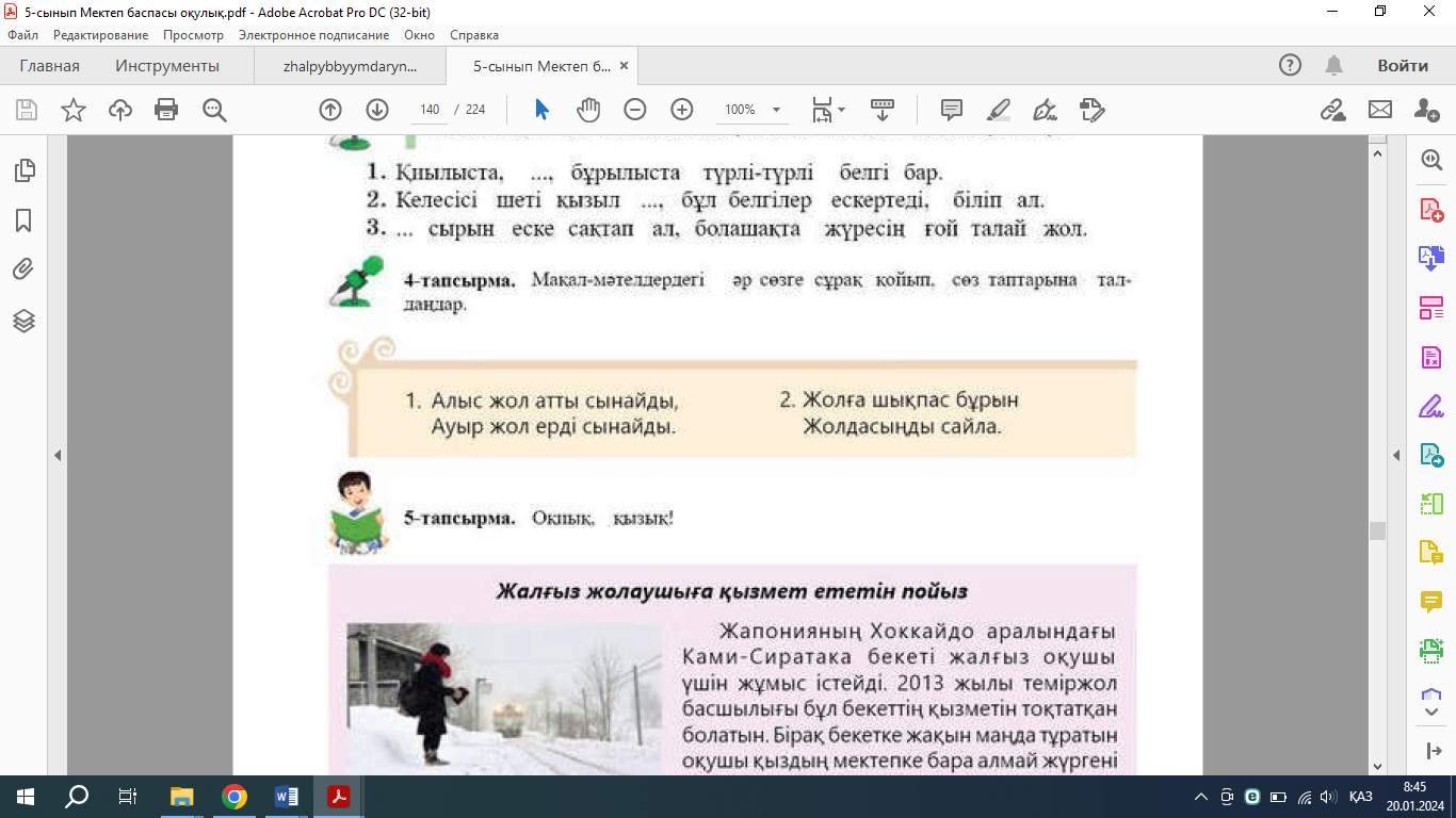 4-тапсырма. Мақал-мәтелдерді оқып, мазмұнын ашыңдар. Әр сөзге сұрақ қойып, сөз таптарына талдаңдар.