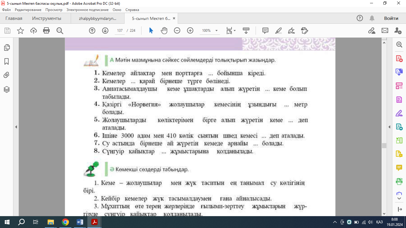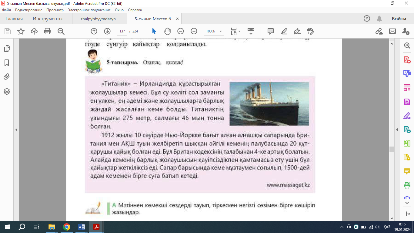 5-тапсырма. Оқиық, қызық. А. Мәтіннен көмекші сөзерді тауып, тіркескен негізгі сөзімен бірге көшіріп жазыңдар.