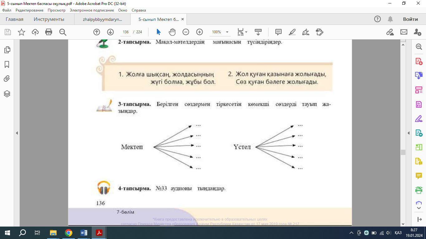 № 33- аудионы тыңдаңдар. А. Мәтін мазмұнына сәйкес сөйлемдерді толықтырып жазыңдар.