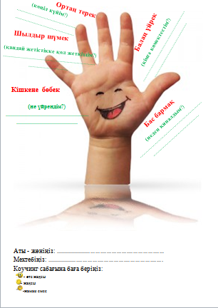 Үйге тапсырма: Рефлексия. «Шығу парағын» пайдаланып, төмендегі сұрақтарға жауап бер. 1. Бүгін не үйрендім? 2. Сабақ бойынша нені түсінбедім? 3. Келесі сабақта қандай мәселеге көңіл аудару керек? |