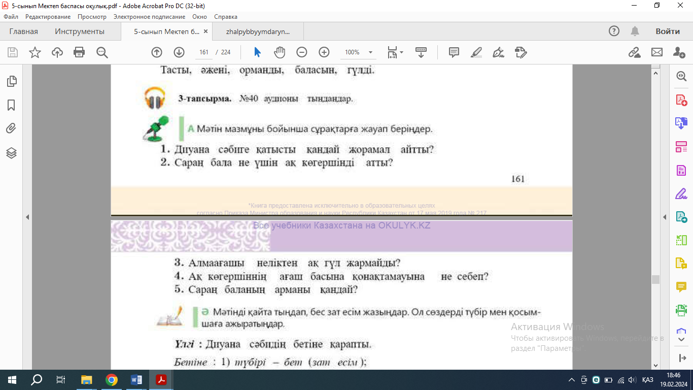 Тыңдалым мәтінін мұқият тыңдайды. «Сұрақтар қобдишасы» әдісі бойынша тыңдалым мәтіні бойынша сұрақтарға жауап береді. Оқылым мәтіні мен тыңдалым мәтініндегі ортақ идеяны түсінеді; Оқылым және тыңдалым мәтіні негізінде жинақы мәтін жазады; Мәтінді қайта тыңдап, бес зат есім жазады; Ол сөздерді түбір мен қосымшаға ажыратады. Мысал өлеңмен танысып,өлеңнен септік жалғаулы сөздерді тауып жазады; Өлеңнен тәуелдік жалғаулы сөздерді тауып жазады; Ойларын дәлелдейді. Тақырып бойынша дәлел келтіре отырып, ой бөлісіп, өз көзқарасын білдіреді, қорытынды жасайды. |