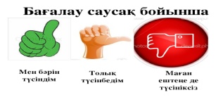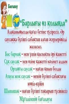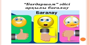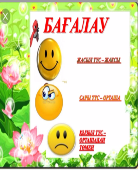 «Жапондық бағалау» әдісі арқылы бағалайды. Яғни «Дұрыс келісемін», «Толықтырамын, басқа көзқарасым бар», «Менің сұрағым бар». Сонымен қатар 1-10 баллдық жүйе бойынша оқушылардың сабаққа қатысу белсенділігі бойынша бағаланады. |