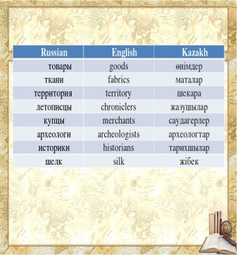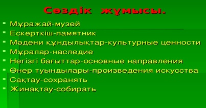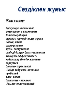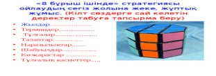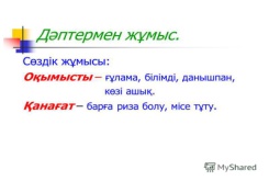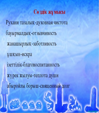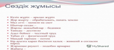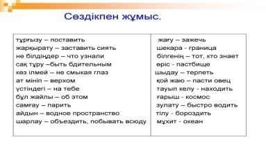 Жазылым Тарих-история-history Қызмет-служба-service Тілін табу-угодить-please Замануи-современный-modern Құрал-средство-way Жас ұрпақ-юное поколоение-young generation Лайық-достойный-worthy Білімді-образованный-educated Білікті-квалифицированный-skilled |
