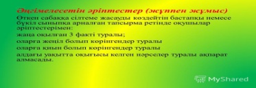12- тапсырма: Жұптық жұмыс Оқулықта берілген тапсырмаларды орындатады, бақылайды, мысал береді. 8-тапсырма Топтық жұмыс