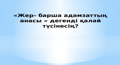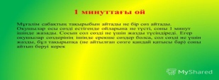 (Ұ) «Миға шабуыл» әдісі арқылы өткен тақырыппен жаңа сабақты байланыстыру мақсатында ой қозғау сұрақтарын ұжымдық талқылау. Мұғалім оқушыларға сабақтың тақырыбы, мақсатымен таныстырады. |