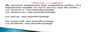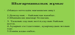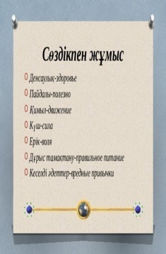 Жазылым Денсаулық-здоровье-health Зор-огромный Байлық-богатство-welth Дұрыс тамақтану-правильное питание Салауатты өмір салты-здоровый образ жизни Спорт-sport Кепіл-залог-quarantee Тазалық-чистота-cleanness |