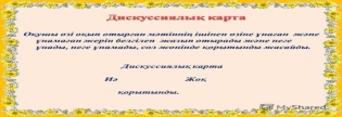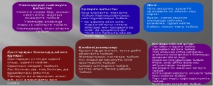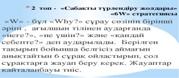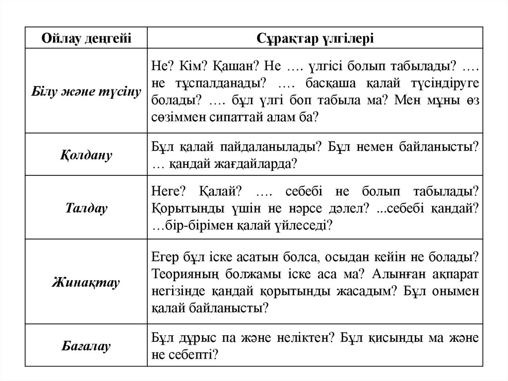Тыңдалым Оқылым Мәтінді оқиды. Топқа бөлініп, мұғалім ұсынған тапсырманы орындайды. 1-топ: «Блум таксономиясы» бойынша мәтінмен жұмыс жасайды 2-топ: «Дискуссиялық карта» арқылы мәтіндегі ұнаған, ұнамаған тұстарына түсінік береді. 3-топ: «6 неліктен» тәсілін қолданып сұрақтар жазады. |