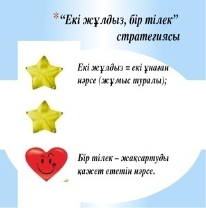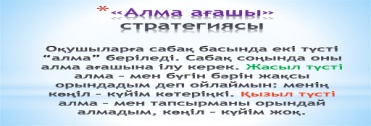Тиімділігі: Оқушылар бір-біріне тілек айту арқылы жақындасады, көңіл күйін көтереді және бауырмалдығын оятады. Саралау: Бұл жерде саралаудың «Жіктеу» тәсілі қолданылады. Оқушылардың оқуға деген қызығушылығын арттыру мақсатында мүмкіндігінше оларға таңдау еркіндігі беріледі |