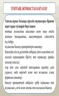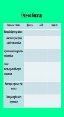 Дескриптор: Жалпы - 4 балл. - Топтар бір-бірін критерийге сай бағалап, комментарий жазып отырады.