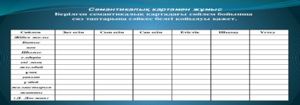 Дескриптор: Жалпы – 3 балл. - Сөйлем құрайды - Кестені толытрады.