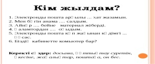 Жазылым Құрал-средство Тарату-распространять Сапалы-качественный Теру-набирать Сурет-рисунок Әртүрлі-разнообразный Ми-головной мозг Зиян-вредный Ағза-организм Әлем-мир |