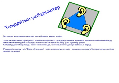 Мақсаты: оқушылар бойында идея немесе тілек білдіру, тыңдау дағдыларын дамытуға бағыттау, сондай-ақ барлық оқушыларды қатыстыру арқылы оқыту жағдайларын теңестіру.