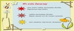 Қалыптастырушы бағалау: Өз ойын дұрыс мағынада білдіріп, талқылауға белсенділікпен қатысқан оқушыға «Жарайсың!» деген мадақтау сөзімен ынталандыру. |