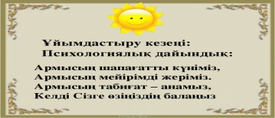 (Ұ). Ұйымдастыру кезеңі: 1. сәлемдесу, түгендеу. 2. Ынтымақтастық атмосферасын қалыптастыру |