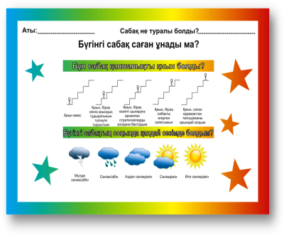 Оқушылар бүгінгі сабақтың мақсаты, тақырыбы бойынша өз ойын айту арқылы сабаққа қорытынды жасайды. Рефлексия: