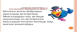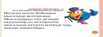 8-тапсырма: Оқулықта берілген тапсырмаларды орындатады, бақылайды, мысал, үлгі көрсетеді.