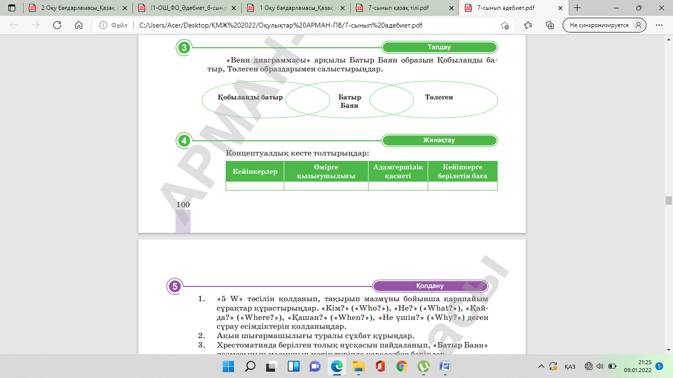 7.1.3.1 Көркем шығармадағы кейіпкерлердің типтерін жасалу тәсілдері тұрғысынан анықтау; 7.1.4.1 көркем шығармадағы кейіпкер бейнесін ашып, үзінділерді жатқа айту |
