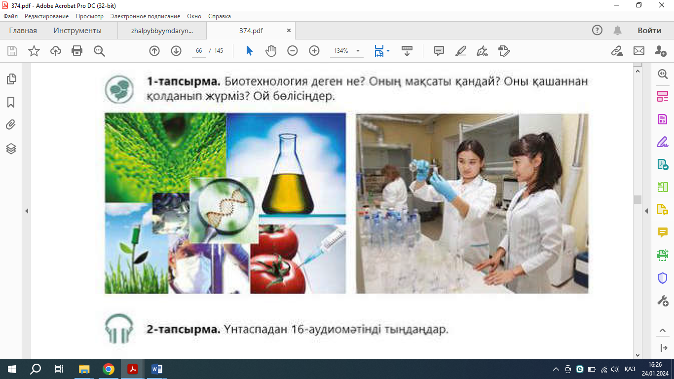 Үнтаспадан 16-аудиомәтінді тыңдаңдар. А. Мәтіннің қандай пәндермен байланысы бар екенін дәлелдеп айтыңдар. Б. Биотехнологиялық жолмен алынатын биологиялық белсенді заттарды санамалап көрсетіңдер. 1________________________________________________________________ 2________________________________________________________________ 3________________________________________________________________ 4________________________________________________________________ 5________________________________________________________________ 3-тапсырма. Мәтіннің жанрын, стилін анықтаңдар. Қай стильдегі мәтін екенін тілдік бірліктері арқылы дәлелдеңдер. 4-тапсырма. Мәтінді қайта тыңдап, термин сөздерді анықтап, түсініктеме беріңдер. Кестенің тілдік ерекшелігі бөліміне жазыңдар.