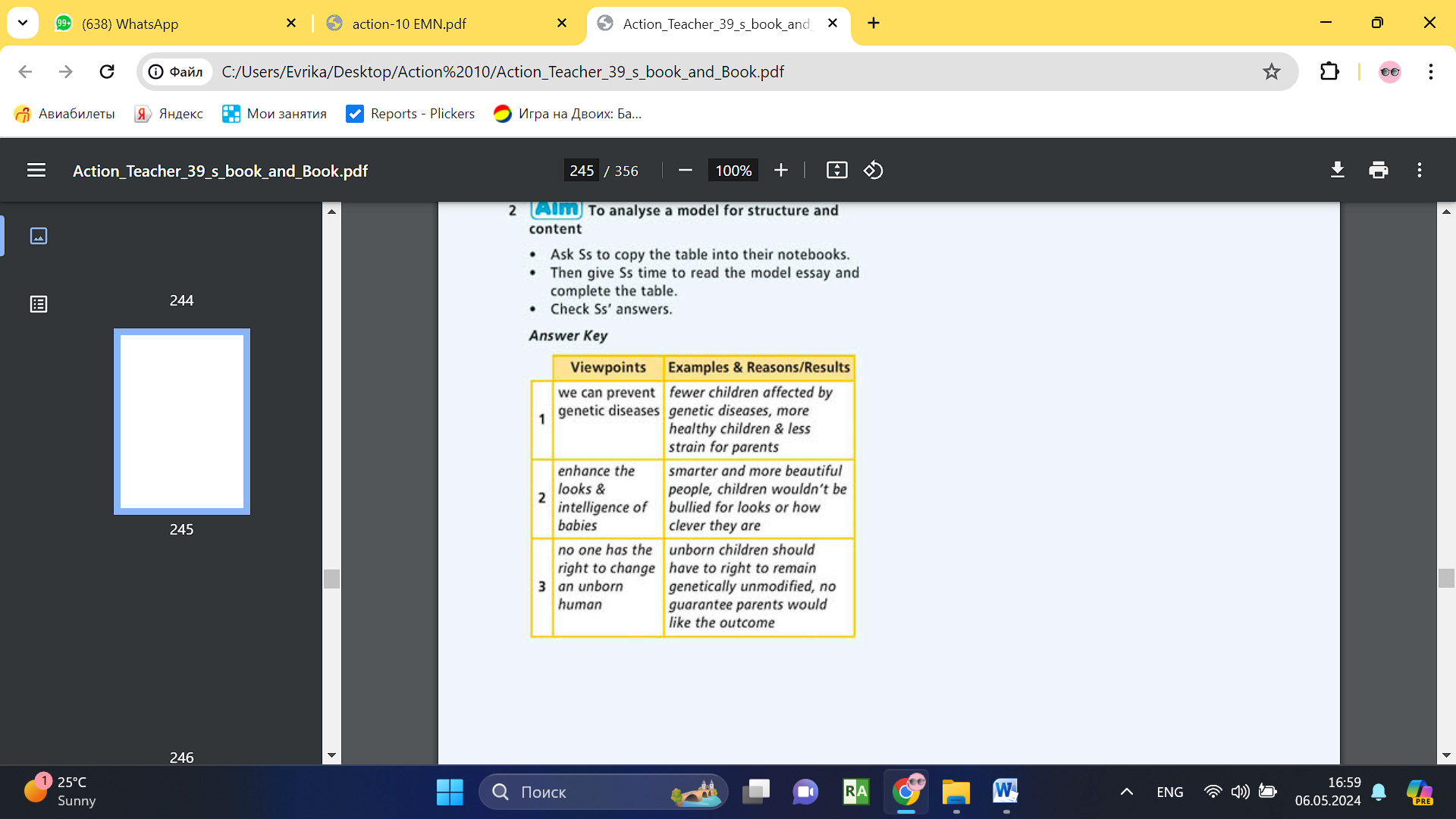 • Learners read the rubric. Underline the key words and answer the questions. ANSWERS 1 an essay 2 my teacher 3 my opinion on designer babies 4 120-180 words 5 formal 6 (Suggested Answer Key) I think that it is immoral to create designer babies. Just because we have the ability to do something does not always mean that we should do it. Also, there may be unknown consequences to interfering with DNA • Learners read the model. Copy and complete the table in your notebook ANSWERS