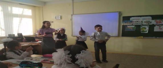 Assessment criteria are: Give basic information about animals at sentence level. Write topic related words correctly. IV. The main part of the lesson: In our open lesson we have tasks for our teams: Task 1: 6 Thinking hat Teacher brings 6 hats. Learners must choose one hat. Each hat has got name of animal. Learner shows this animal to class through action. 1. Red hat (fish) 2. Green hat (goat) 3. Yellow hat (snake) 4. Black hat (crocodile) 5. White hat (monkey) 6. Blue hat (rabbit) Task 2: Game: “Which animal?” The teacher give for 2 teams list of paper with tasks. In the task the learners must steak the names of animal in the first circle (if the animal are small, big, fast or slow); second circle (if the animal can fly, run, swim, jump); third circle (if the animal live in the water, on the farm, in the jungle, in the sea).