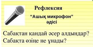 Мұғалімді тыңдайды Сұрақтарға жауап беред Сұрақтарға жауап береді Мұғалінің ақпаратын тыңдайды Сергіту сәтті орындау Дескриптор: - сөздерді жазады Дескриптор: - ақпаратты қабылдау тәсілдерін анықтайды Дескриптор: - интерактивті тапсырмаларды орындайды |