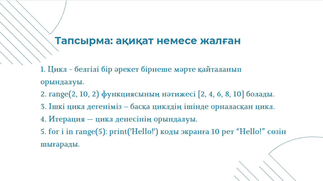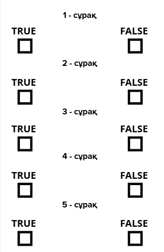 Тақырыпқа назар салып тыңдайды, кері байланыс сұрақтарына жауап береді. Практикалық тапсырманы орындайды. Сұрақұа мән беріп оқыпғ ақиқат немесе жалған екенін белгілейді. |