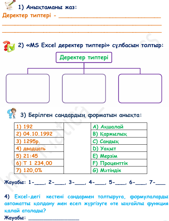 Жұмыс парағы бойынша тапсырмаларды орындайды: Дескриптор: - «Деректер типтері» анықтамасын жазады; Дескриптор: - сұлбаны толтырады;