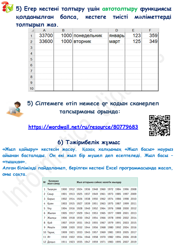 5-тапсырма. Тәжірибелік жұмыс «Жыл қайыру» кестесін жасау. Қазақ халқының «Жыл басы» наурыз айынан басталады. Оны екі жыл бір мүшелі деп есептеледі. Жыл басы «тышқан». Алған білімді пайдаланып, берілген кестені Excel программасында жасап оны сақта.