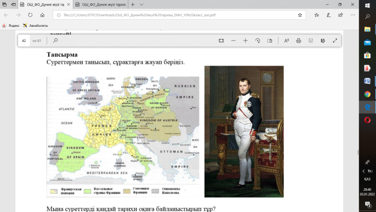Мына суреттерді қандай тарихи оқиға байланыстырып тұр? ________________________________________________________________________________ Деректерді оқи отырып төмендегі сұрақтарға жауап беріңіз. 1799 ж 17 қазанда Францияда билік басына келген Н.Бонапарт және оның министрлері қоғамда едәуір күшке айналып келе жатқан жаңа сословие буржуазияның мүддесін қызғыштай қорғаушылар ретінде көрінді. Н.Бонапарт үкіметі Францияда және оған бағынышты аумақтарда феодалдық жүйені қиратып, капиталистік қатынастарды орнықтыру мақсатында реформалар жүргізді, бұл реформа Наполеон кодекстері деген атпен белгілі. Наполеон кодекстері Еуропада өндіргіш күштердің қарқынды дамуына себепкер болып, тауар-ақша қатынастарының жедел дамуына себепкер болды. Банктер жұмысы жолға қойылып, буржуазия уақыт өткен сайын барынша күш алып, бұрынғы сословие дворяндарды қоғамнан ығыстыра бастады және олардың бұрынғы артықшылықтары мен қоғамдағы ықпалын жоя бастады. І Наполеонның Құрлықтық оқшаулау туралы Декреті (1806 ж.) 1. Англия барлық өркениетті халықтардың тарапынан мойындалатын халықаралық құқықты бұзды. 2. Ол өзіне дұшпан ретінде жау мемлекеттің кез келген азаматын таныды. Сол себептен әскери кемелердің экипажын ғана емес, сонымен бірге, сауда кемелерінің экипаждарын да, өз сауда істері бойынша саяхаттап жүрген саудагерлер мен коммивояжерлерді де әскери тұтқындар деп жариялады. 3. Ол сауда кемелеріне, тауарларға және жеке тұлғалардың мүлкіне басып алу құқығын таратады… 4. Ол қалалар мен берік орнатылмаған сауда порттарына оқшаулау құқығын кең жаяды; өзі бірде-бір әскери кемені ұстамайтын аймақтардың өзін оқшауланған өңір деп жариялайды… ЕБҚ оқушыға тақырып бойынша өз мысалымен толықтыруды, ойдан құрастыруды ұсыныңыз 5. Бұл жан түршігерлік оқшаулау құқықтың артығынан пайдаланылуы халықтардың арасындағы қарым-қатынастарға кедергі жасау және де материктегі өнеркәсіп пен сауда қалдықтарында Англияның сауда мен өнеркәсібін дамыту... Біз, Англияға қатысты, оның өзі теңіз заңнамасында бекіткен тәсілдерді қолдануға бел байладық. 1-бап. Британ аралдары оқшауланған қалыптағы жағдайда деп жарияланды. 2-бап. Британ аралдарымен сауда жасау мен хабар алмасуға тыйым салынды... 3-бап. Біздің әскер орныққан мемлекетте… табылған Англия азаматы… әскери тұтқын деп жарияланды. 4-бап. Ағылшын азаматының қарамағындағы барлық қоймалар мен тауарлар… заңды жүлделер деп жарияланды. 5-бап. Ағылшын тауарларын саудалауға тыйым салынды ... 7-бап. Англиядан немесе ағылшын отарлық иеліктерінен келген кез келген кеме… бірде-бір портта қабылданбады. Наполеон кодекстері Еуропада капиталистік қатынастардың қарқынды дамуына себепкер болды деген тұжырыммен қаншалықты келісесіз? ________________________________________________________________________________ ________________________________________________________________________________ Осы декретті қабылдау арқылы Н.Бонапарт қандай мақсатты көздеді деп ойлайсыз? ________________________________________________________________________________ Н.Бонапарт бүкіл Еуропаны бір саяси-экономикалық қауымдастыққа біріктіруді көздеді, бірақ бұған Англия қарсы болды, осылай әйгілі императордың тарихтағы алғаш рет Еуропалық интеграцияны жүргізу мақсаты орындалмай қалды деген сөзбен келісесіз бе? ________________________________________________________________________________ ________________________________________________________________________________ Декрет арқылы Англияны экономикалық тұрғыда тұншықтыру әрекеті қаншалықты нәтижелі болд