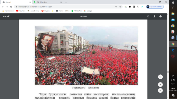 Мәтінмен жұмыс Кемалдық революция және 20-30-жылдары жүргізілген реформалар тізбегі Түркияда зайырлы мемлекеттің негізін қалады. Дін мемлекеттен бөлініп, шариғаттық соттар мен мектеп-медреселер жойылды, әйелдердің құқық ерлермен теңестірілді. Түркия еуропалық күнтізбе бойынша өмір сүре бастады. Міндетті түрде еуропалық киім кию бекітілді, көп әйел алушылыққа тыйым салынды. азаматтық неке кию калыптасты. ЕБҚ оқушыға тапсырма шығарылып беріледі. Кестемен жұмыс