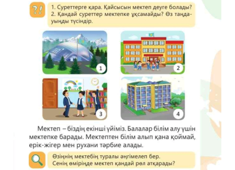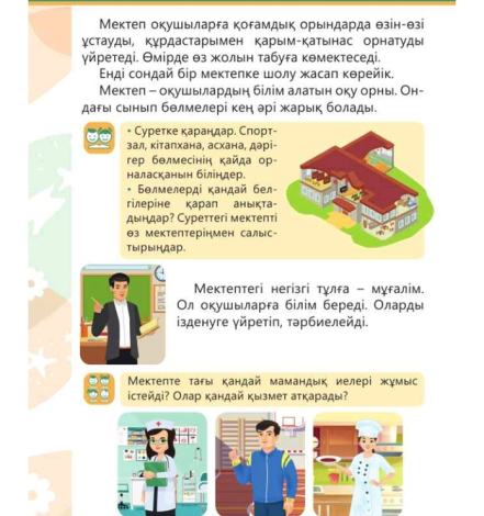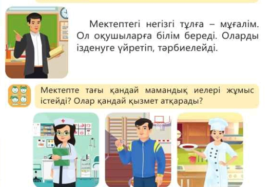 Мектепте ікмдер жұмыс істейтінін және олардың еңбектерінің маңызын білесің. Өз мектебің туралы айтуды үйренесің |