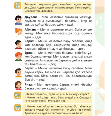Қысқаша мәліметті оқиды, танысады, талдайды Белсенді оқу тапсырмасын орындайды, сұрақтарға жауап береді. Неліктен ондай шешім қабылдады, түсіндіреді. Оқушылар би билеп сергіп қалады Мектептегі негізгі тұлға жайлы ақпаратты оқиды. Мұғалім туралы тағы қандай ақпарат біледі бөліседі. Мектеетегі мамандық иелері жайлы пікірлерімен бөліседі, әр кім өз ойын талқыға салады. Парталас отырған көршіңмен ойыңмен бөліс. Берілген сұраққа жауап береді. Топтық жұмыс Берілген пікірлердің ішінен дұрыс деп санаған оқушы жауаптарын таңдап, себебін түсіндіреді. Үй тапсырмасын жазады Сабақтан алған әсерлерін стикерге жазып, ағашқа жабыстырады |