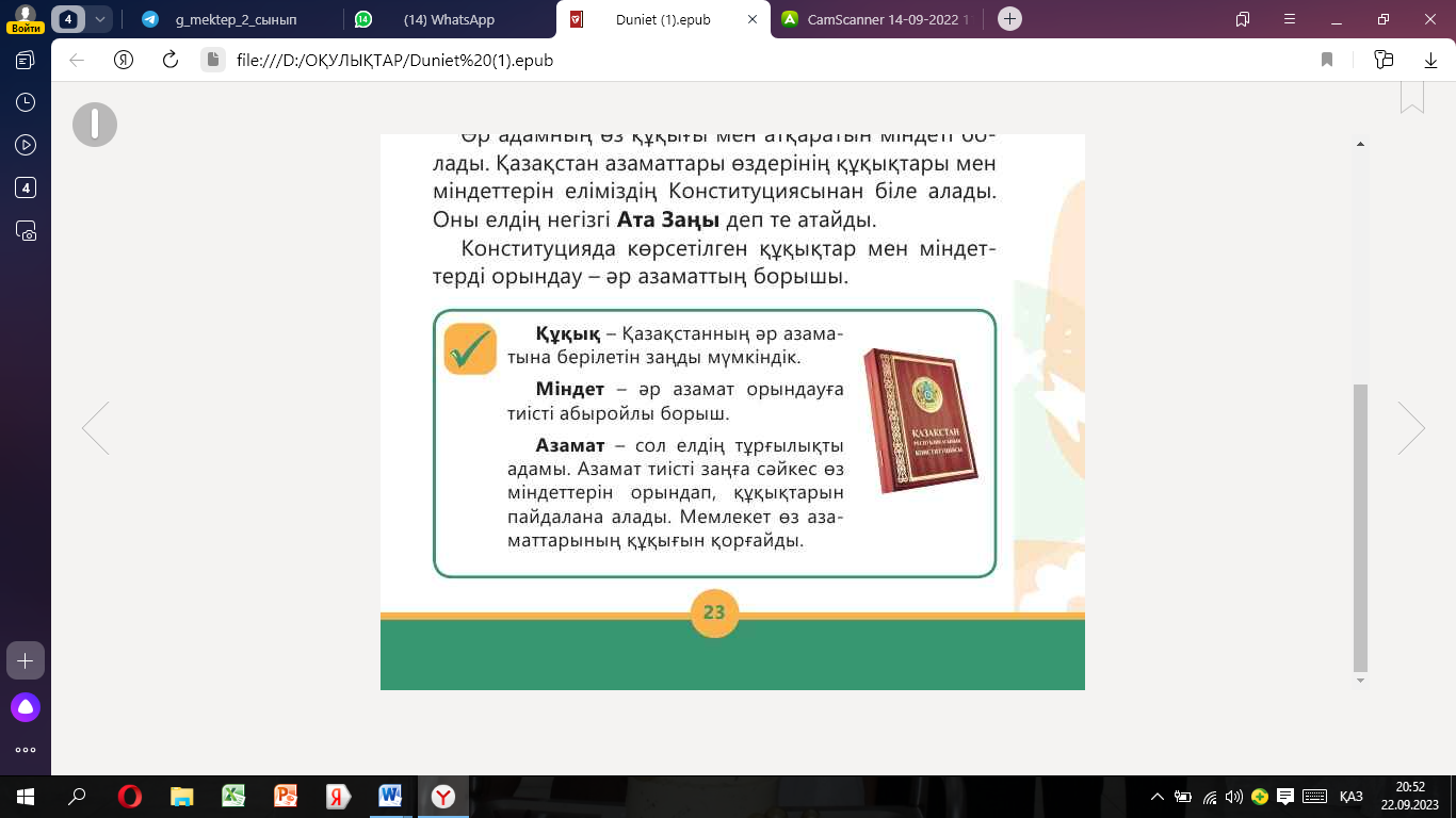 1-тапсырма ФС Ұжымдық жұмыс «Өз ойым» әдісі Өз құқығыңды білесің бе? Зертте Өзіңнің құқығың мен міндеттеріңе сәйкес келетінін белгіле. ЕББҚ Тапсырманы орындауда қолдау көрсету Талқылау сұрақтары: 1. Көрсетілген міндеттерді қалай орындап жүрсің? |