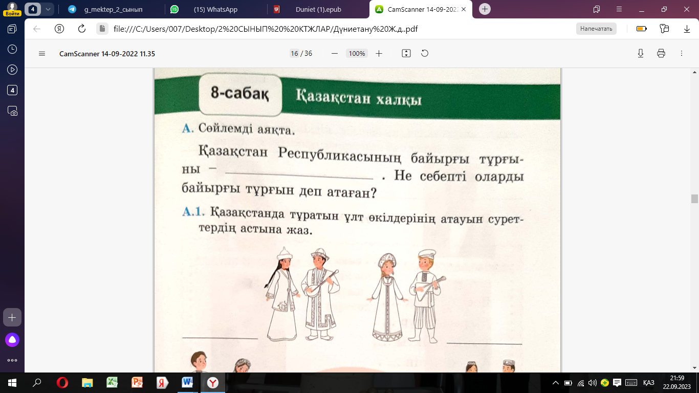2- тапсырма Жұптық жұмыс «Із кесуші» әдісі Берілген мақалды оқып, мағынасын түсіндір ЕББҚ Тапсырманы орындауда қолдау көрсету Талқылау сұрақтары: 1.Өзің тұратын жерде қандай ұлт өкілдері бар? «Тралалалалала» әуеніне қол жаттығуына арналған қимылдар жаса |