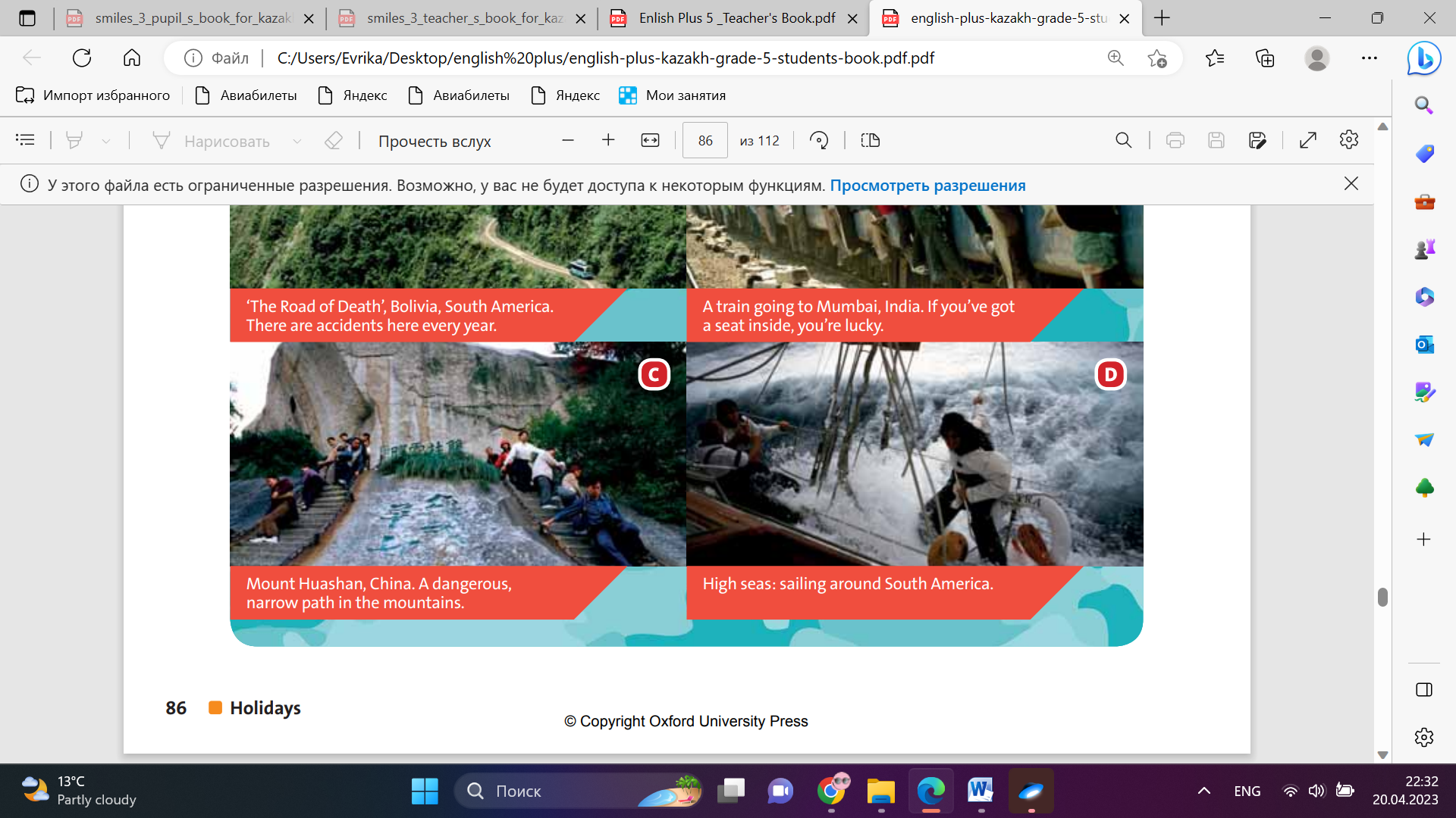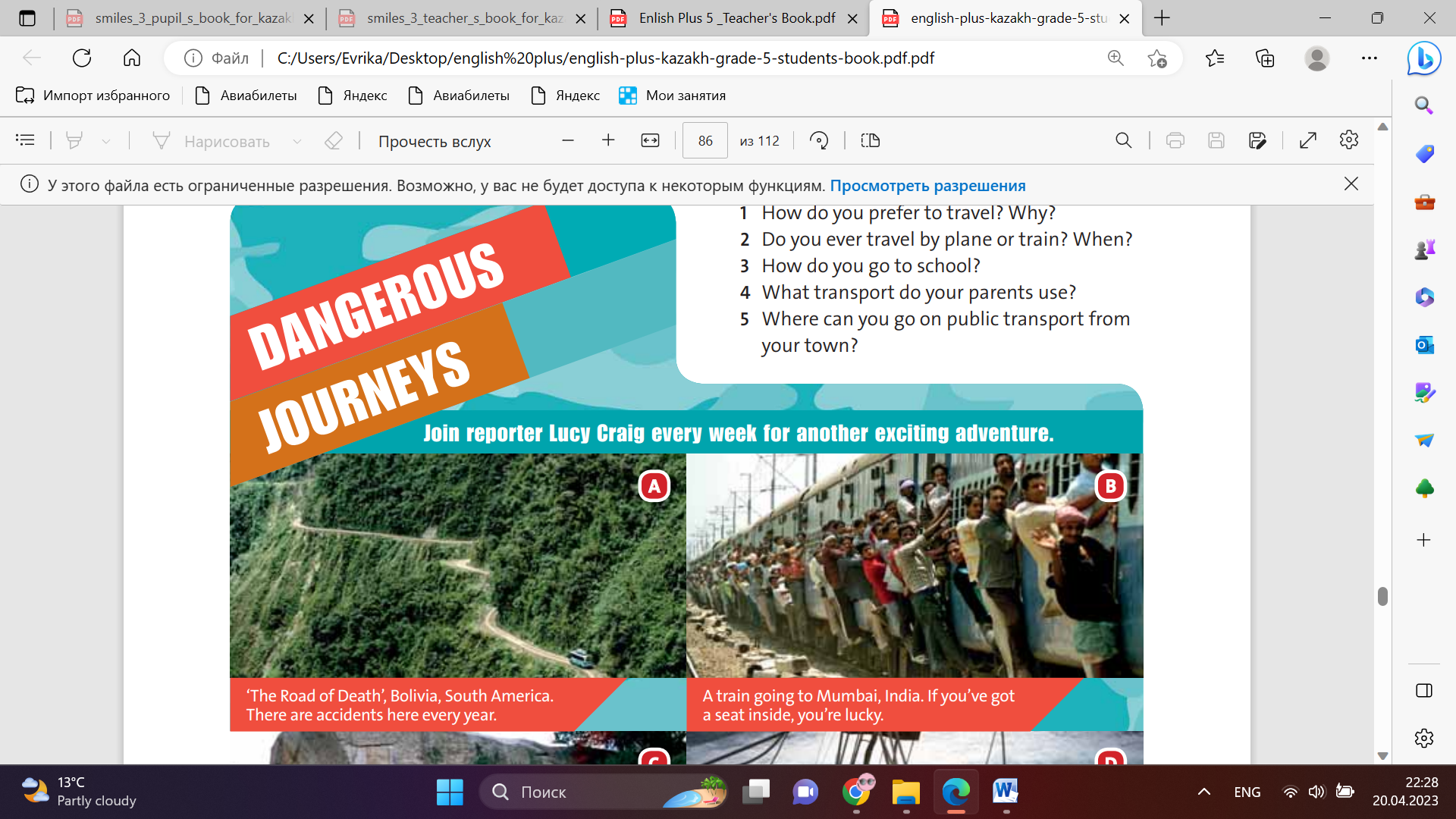 Students check the meaning of the words in the box. Then complete the table. Answers: Transport: plane, bus, car, train Places: river, beach, sea, mountain, road Students look at the information about the Dangerous Journeys programme. Which of the places and types of transport can you see in pictures? Answers: In picture A there’s a road, a bus and mountains. In picture B there’s a train. In picture C there’s a mountain. In picture D there’s a boat and the sea Students listen to three extracts from the programme. Answers: 1 A 2 C 3 B Students listen again and answer the question Answers: 1 She is travelling to La Paz in Bolivia. 2 There is a car with a crazy driver next to the bus. 3 Yes, they are. 4 No, he isn’t. It’s not possible to walk next to other people. 5 Yes, she is. 6 No, they are going to work. |