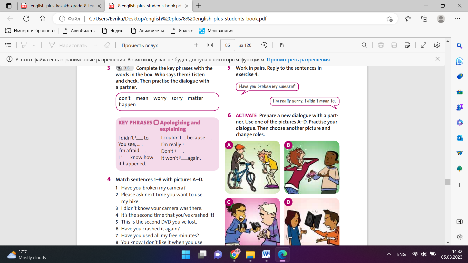 Students complete the key phrases with the words in the box. Who says them? Listen and check. ANSWERS: 1 mean (Mark) 2 don’t (Mark) 3 sorry (Mark) 4 worry (Mark) 5 happen (Mark |
