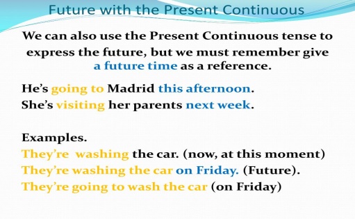 Organization moment : 1.Greeting. Ask about the weather. The teacher sets the lesson objectives, letting students know what to anticipate from the lesson. Warming up Books closed. Write the following on the board: I'm playing tennis tomorrow. Elicit the tense used in sentence (Answer: the present continuous) and then ask students whether the sentence refers to the present or the future. Elicit the fact that it refers to the future. Lead – In