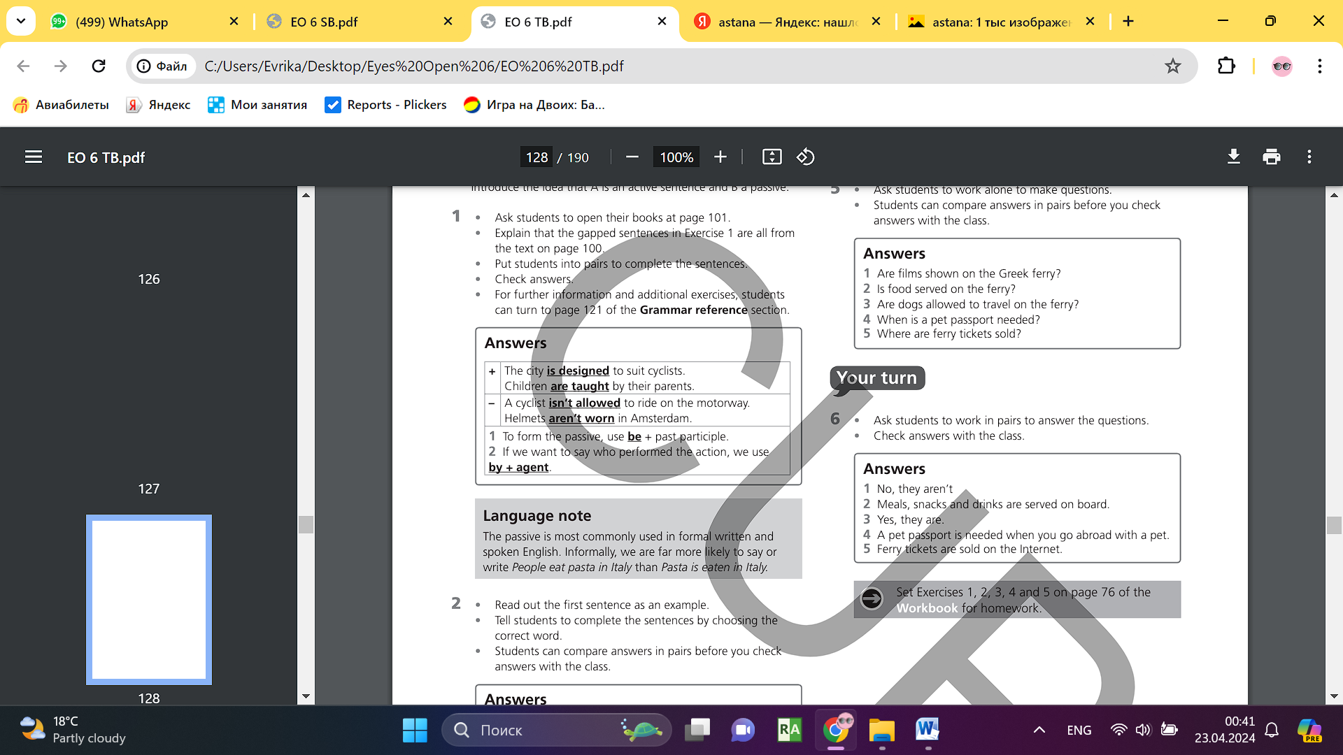 • Learners complete the examples from the text on page 100. Then complete the rules. ANSWERS • Learn choose the correct words. ANSWERS 1 is 2 aren't 3 are 4 made 5 built 6 by • Learn complete the text with the passive form of the verbs. Then listen and check. ANSWERS 1 are driven 2 is closed 3 are served 4 aren't shown 5 aren't allowed 6 isn't provided 7 is needed 8 are sold • Learn look at the questions about the reading on page 100 and complete the rules ANSWERS To form questions we use be + subject + past participle • Learn make questions with the passive form of the verbs ANSWERS 1 Are films shown on the Greek ferry? 2 Is food served on the ferry? 3 Are dogs allowed to travel on the ferry? 4 When is a pet passport needed? 5 Where are ferry tickets sold |