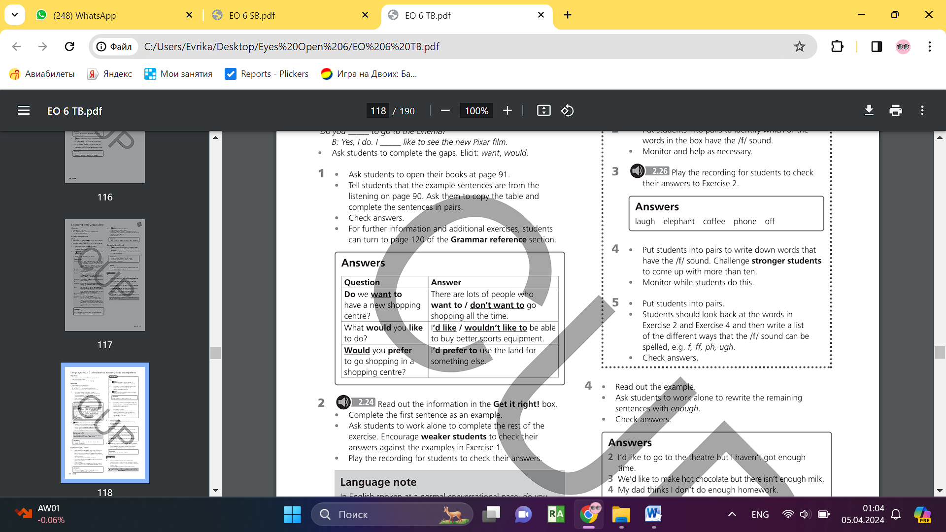 • Learners complete the examples from the listening ANSWERS • Learners complete the conversations with do (n’t) or would (n’t). Then listen and check. ANSWERS 1 Would 2 would 3 do 4 'd 5 Would 6 'd 7 would 8 wouldn't • Learners look at the examples from the listening on page 90. Write enough in the correct place. ANSWERS 1 That might happen if there isn't enough business. 2 I think we've got enough shops here. • Learners rewrite the sentences with enough. ANSWERS 2 I'd like to go to the theatre but I haven't got enough time. 3 We'd like to make hot chocolate but there isn't enough milk. 4 My dad thinks I don't do enough homework. 5 My brother is unhealthy because he doesn't do enough sport. 6 We want to start a football team but we haven't got enough players |