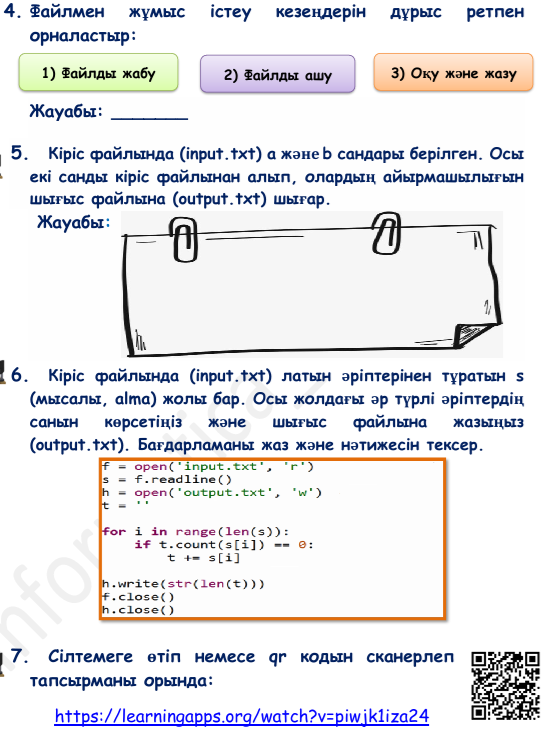 3-тапсырма. Жеке жұмыс. Кіріс файлында (input.txt) латын әріптерінен тұратын s (мысалы, alma) жолы бар. Осы жолдағы әр түрлі әріптердің санын көрсетіңіз және шығыс файлына жазыңыз (output.txt). Бағдарламаны жаз және нәтижесіне тексер.